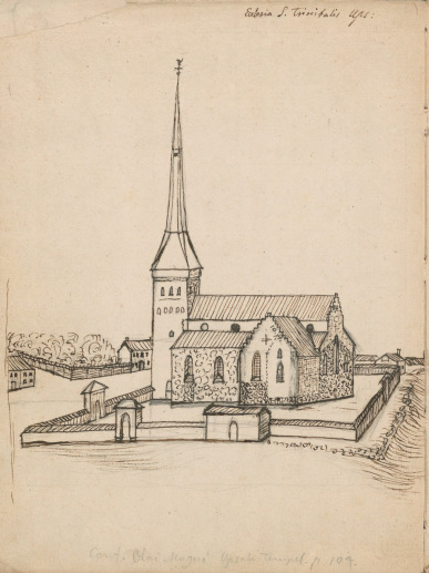 Johan Peringskiölds avritning av Helga Trefaldighet kyrkan från 1709. Det är i slänten i bildens högra kant vi nu har grävt ut.
