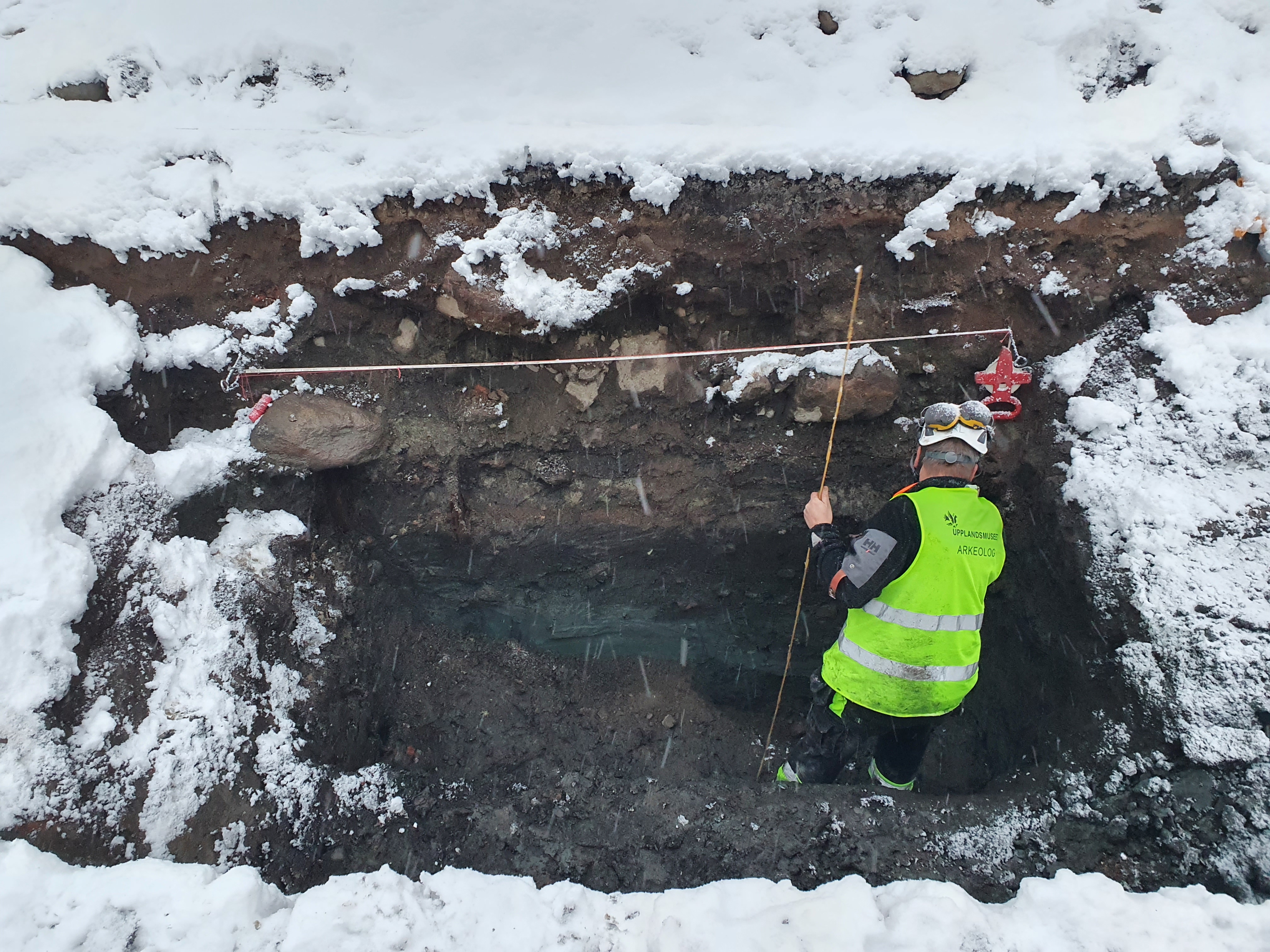 Bild 5. Robin Lucas dokumenterar schaktväggen. Däri ser ni några av grundstenarna som sitter kvar. I övrigt syns inte mycket under snön. Foto: Adam Hultberg, Upplandsmuseet.