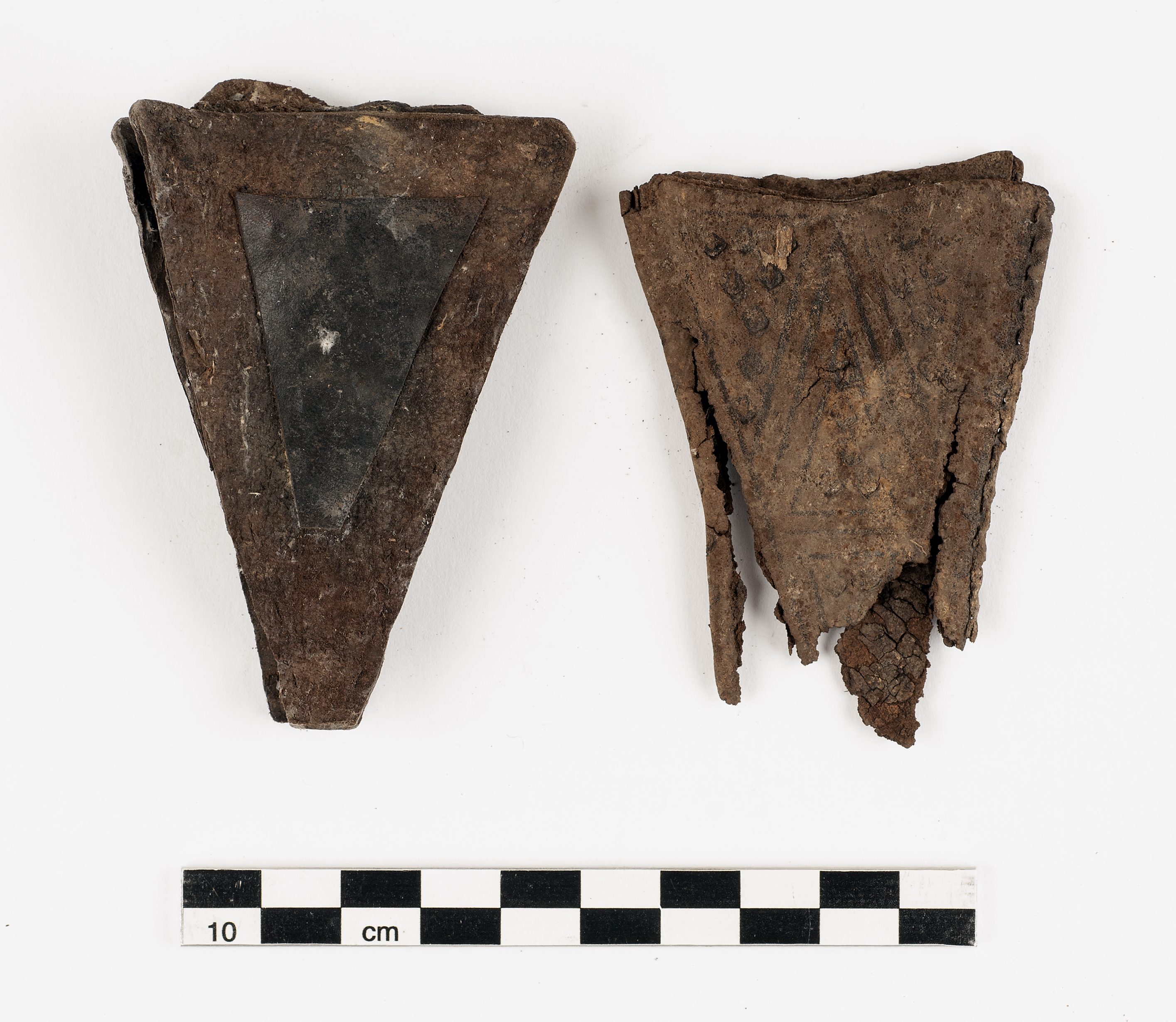 Två föremål med okänd funktion, troligen remändebeslag att fästas längst ned på exempelvis ett bälte. På den vänstra har skinnet skurits så att det visar två olika kvaliteter och på den högra finns skuren och målad dekor av streck och punkter, på baksidan av den högra finns också vågband. Båda föremålen kan dateras till omkring 1300. Foto: Olle Norling, Upplandsmuseet