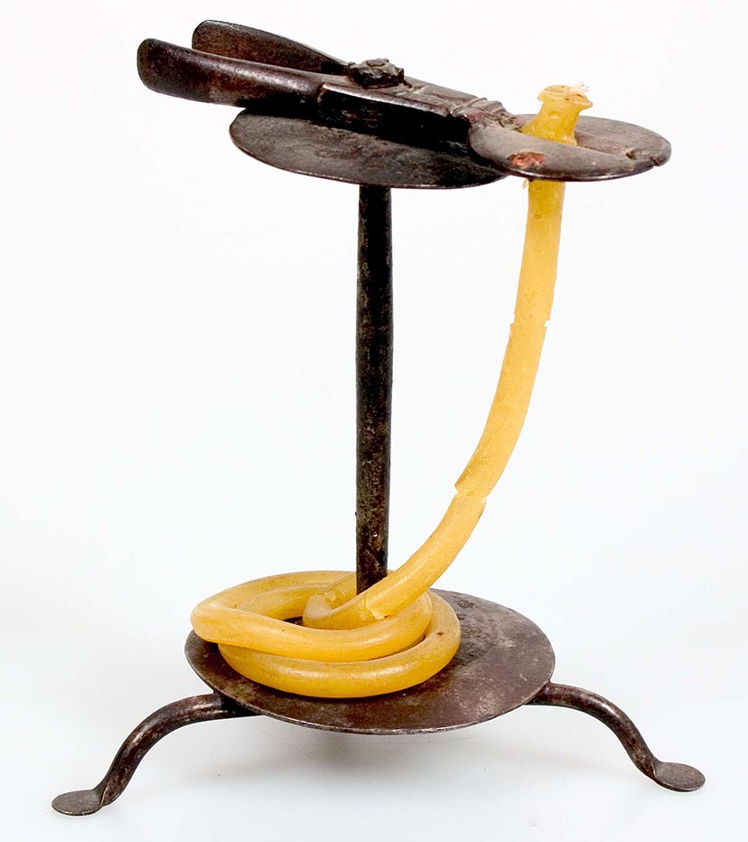 I våra samlingar finner vi en variation av ljushållare och värmekällor av olika slag. Kanske kikar vi lite mer på det längre fram, men vi kan inte låta bli att ta med denna nu, en ljusstake UM08544, eller en så kallad vaxstapelljusstake med ett gult vaxljus. Ljusstaken kom som gåva till Upplandsmuseet 1959 och lär vara tillverkad vid Vedevågs bruk.