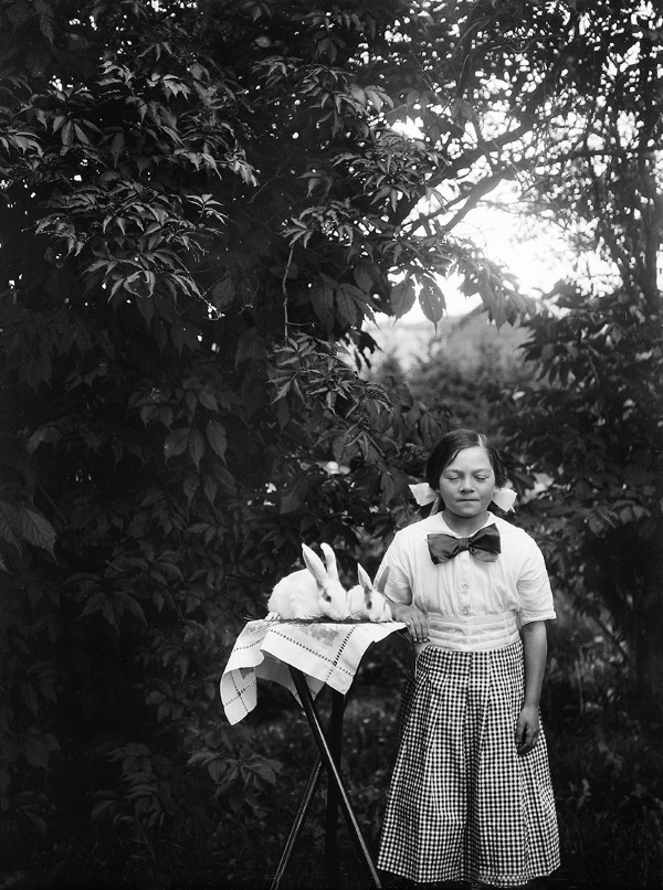 Att fotografera barn kan vara lättare sagt än gjort, det känner nog många av oss igen, och många gånger kan det vara lika svårt med djur. Här har vi att göra med både djur och barn. Det krävdes lite extra av de avbildade objekten då de skulle fångas på bild. John Alinder fotograferade med lådkamera på stativ. Materialets låga känslighet medförde långa exponeringar, det krävdes av de som fotograferades att vara stilla. I det här fallet blev det en bild där flickan blundar. Så lätt hänt, men kaninerna är kvar på bordet i varje fall, vilken tur!