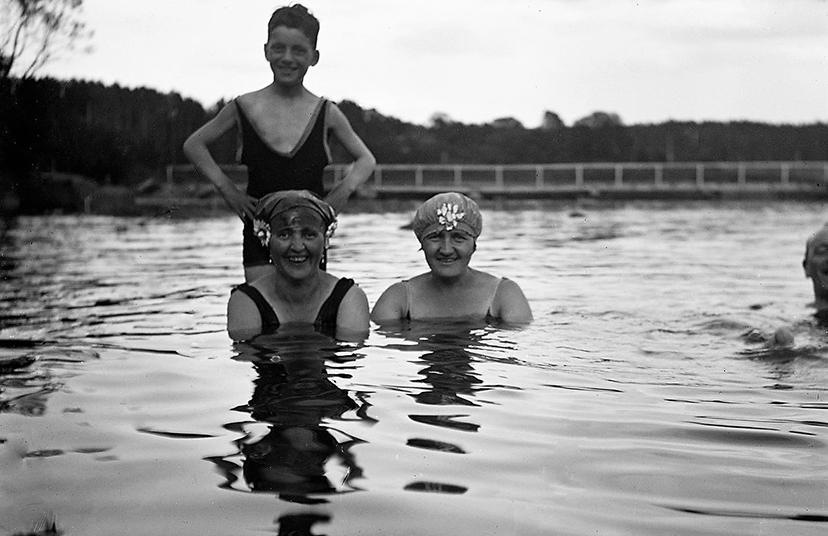 Kanske inte årets första bad, vem vet, men väl ett bad. Bilden ovan är registrerad under rubriken ”Familjen Bergman badar" och ingår i en samling bilder som enligt uppgift har koppling till boktryckare Bergman, verksam i Uppsala kring sekelskiftet 1900. Glasplåtarna, som påträffades på en vind i Lundequistska huset i Uppsala, innehåller främst motiv på familjen Bergman men även ett par bilder som visar verksamheten på boktryckeriet. Fotografen är okänd.